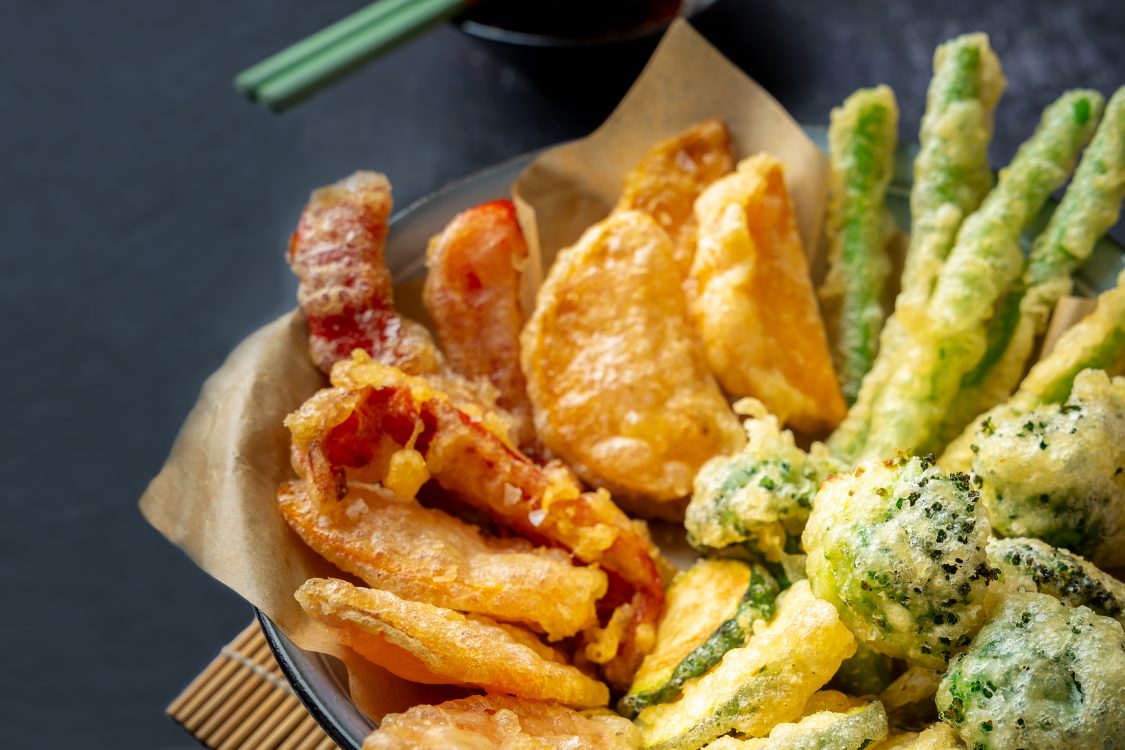 - Gemüse, Fleisch oder Fisch nach Geschmack waschen, trocken tupfen und anschließend durch den Tempurateig ziehen.